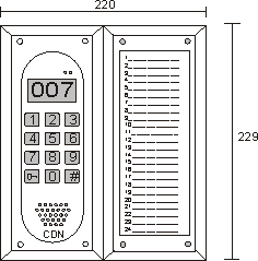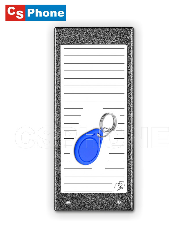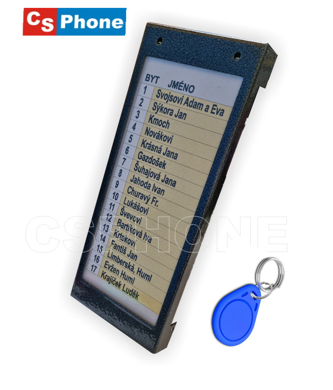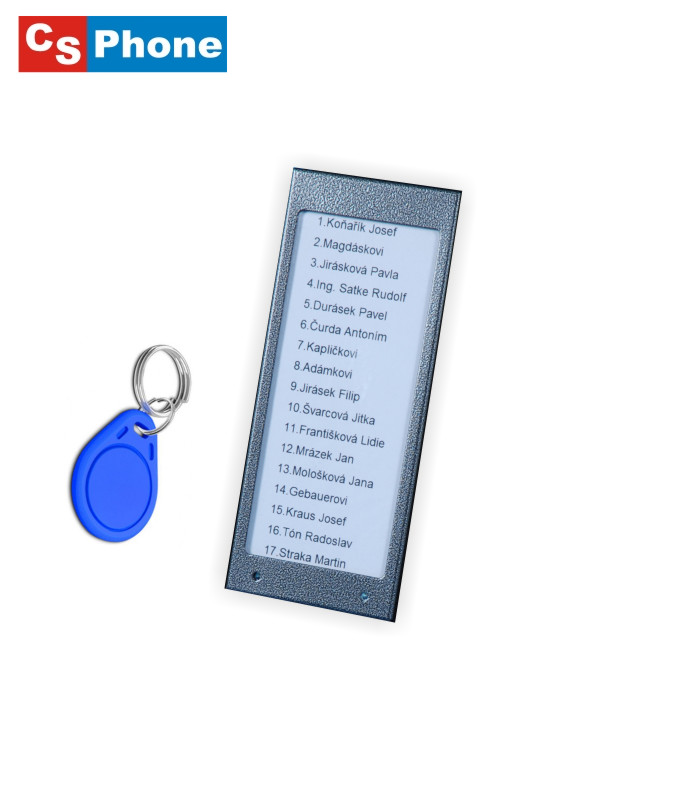 Jmenovkový modul 17N pro systém zvonkového tabla CDN s modrým LED podsvícením. Možnost použít pro 17 až 24 jmen.Vyrobeno ze slitiny hliníku. Proudový odběr podsvícení je 0.01A při 12V. Součástí modulu je čtečka s přístupovým systémem RFID pro bezkontaktní klíčenky. K každému číslu telefonu (bytu) lze přiřadit 6 čipů. Celkem lze tady v jednom systému použít až 1500 čipů.Čipy se programumují přes klávesnici nebo přes PC. Lze použít jak klíčenky tak i RFID karty.