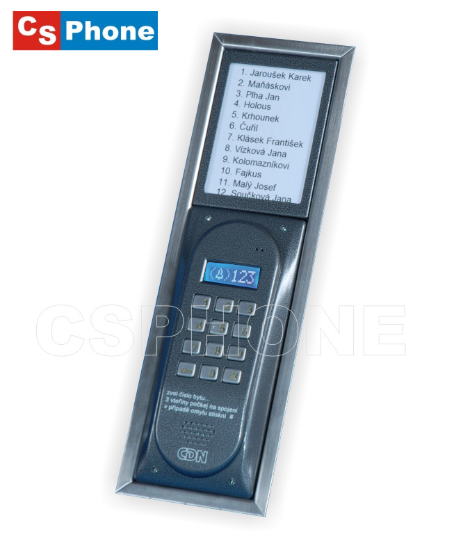 Jmenovkový modul 6N ACC pro systém zvonkového tabla CDN. Součásti jmenovkového modulu je čtečka s přístupovým systémem RFID.
