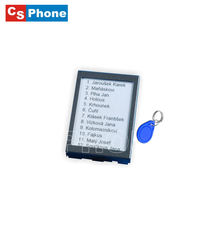 Jmenovkový modul 6N ACC pro systém zvonkového tabla CDN s modrým LED podsvícením. Možnost použít pro 12 jmen.Vyrobeno ze slitiny hliníku. Proudový odběr podsvícení je 0.01A při 12V. Součástí modulu je čtečka s přístupovým systémem RFID pro bezkontaktní klíčenky. K každému číslu telefonu (bytu) lze přiřadit 6 čipů. Celkem lze tady v jednom systému použít až 1500 čipů. Čipy se programumují přes klávesnici nebo přes PC. Lze použít jak klíčenky tak i RFID karty.